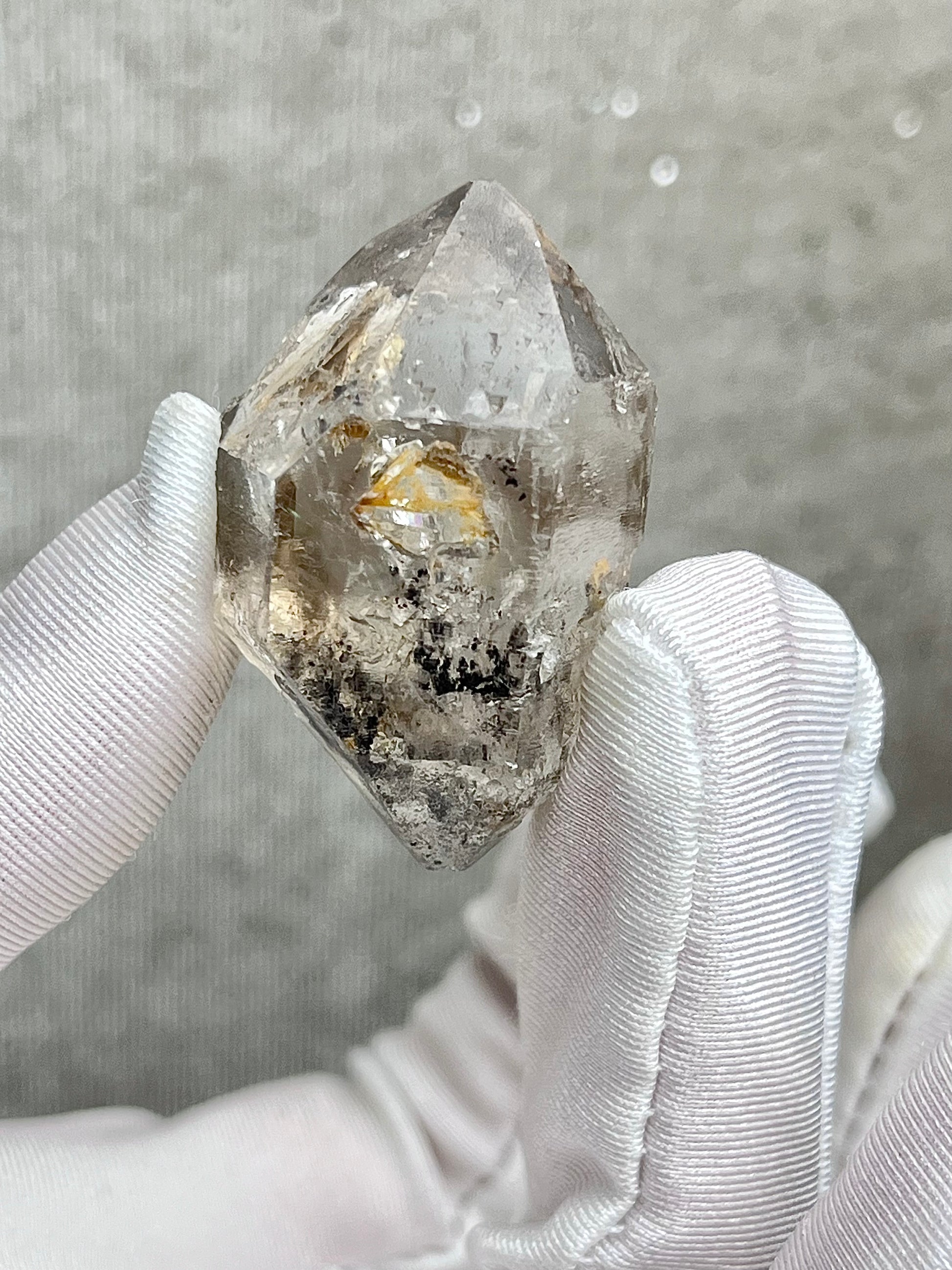 Denne krystallen har to bevegelige bobler med svart sediment.