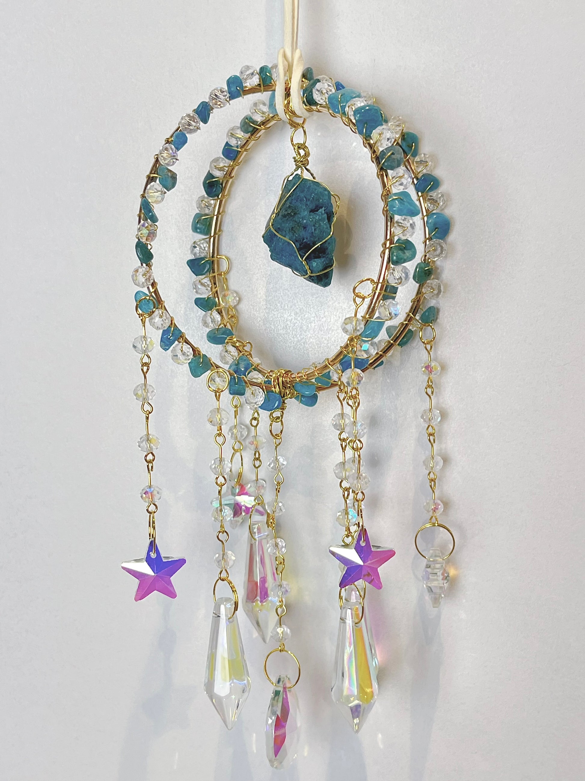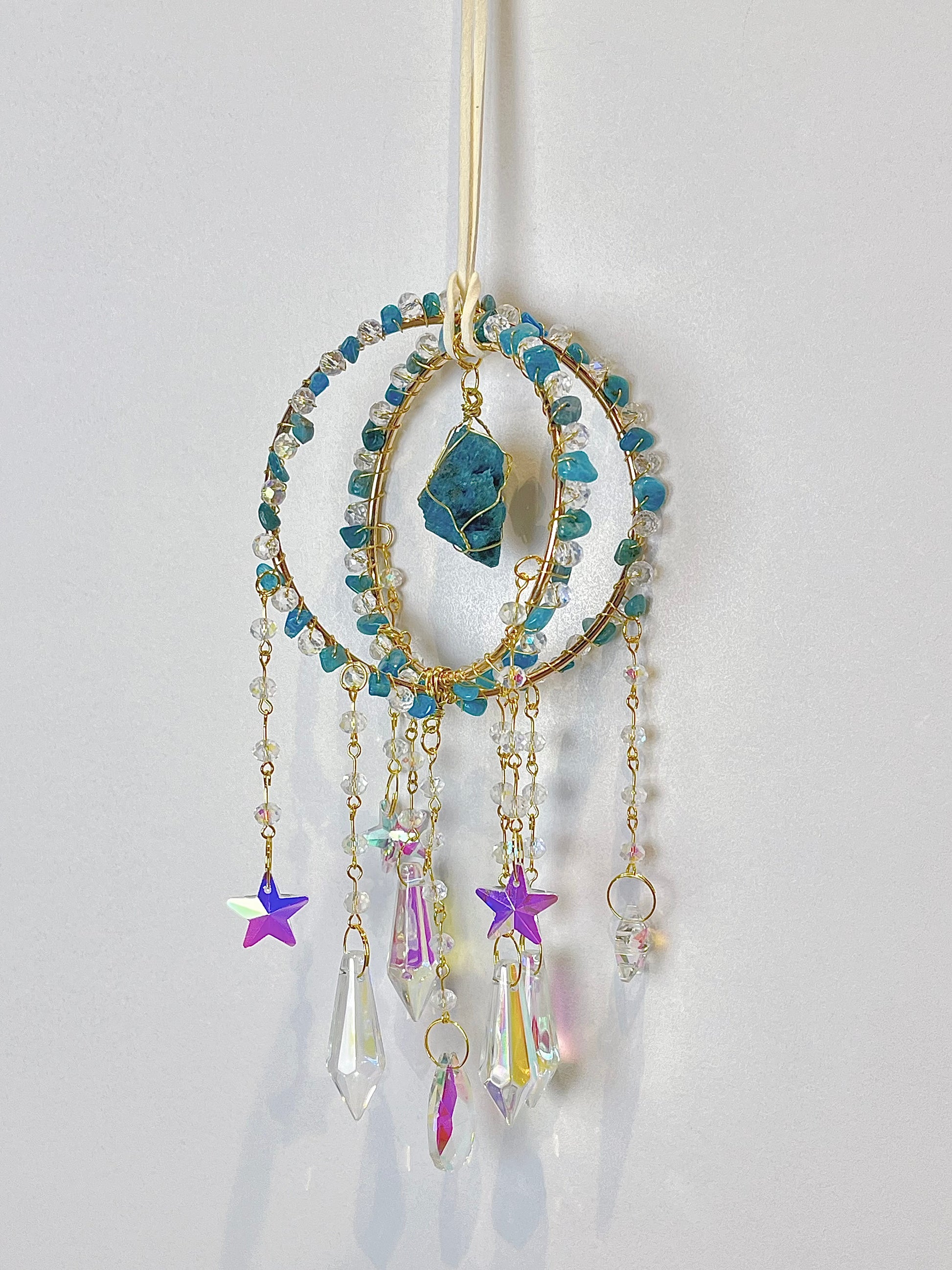 Består av Blå Apatitt, messing og glass.