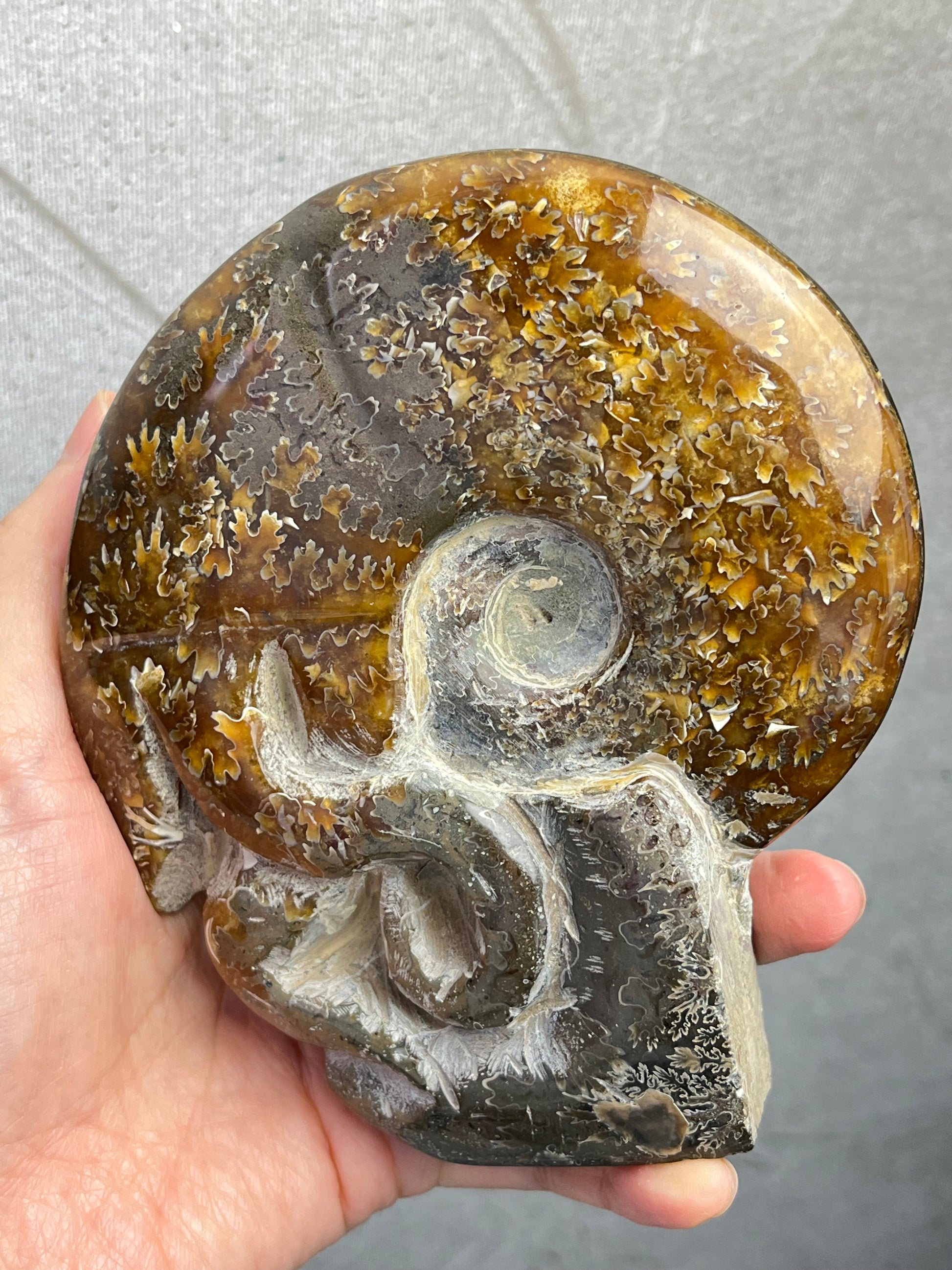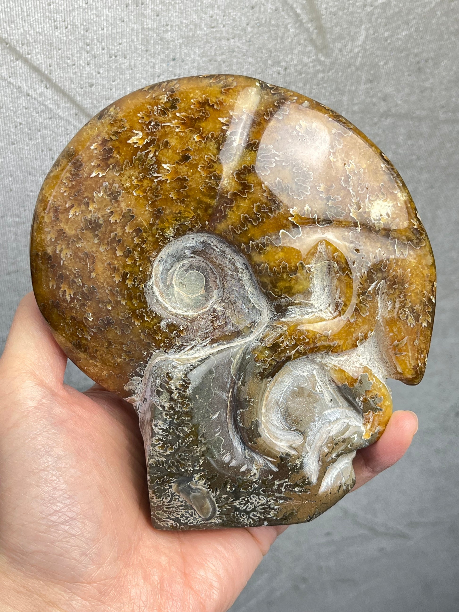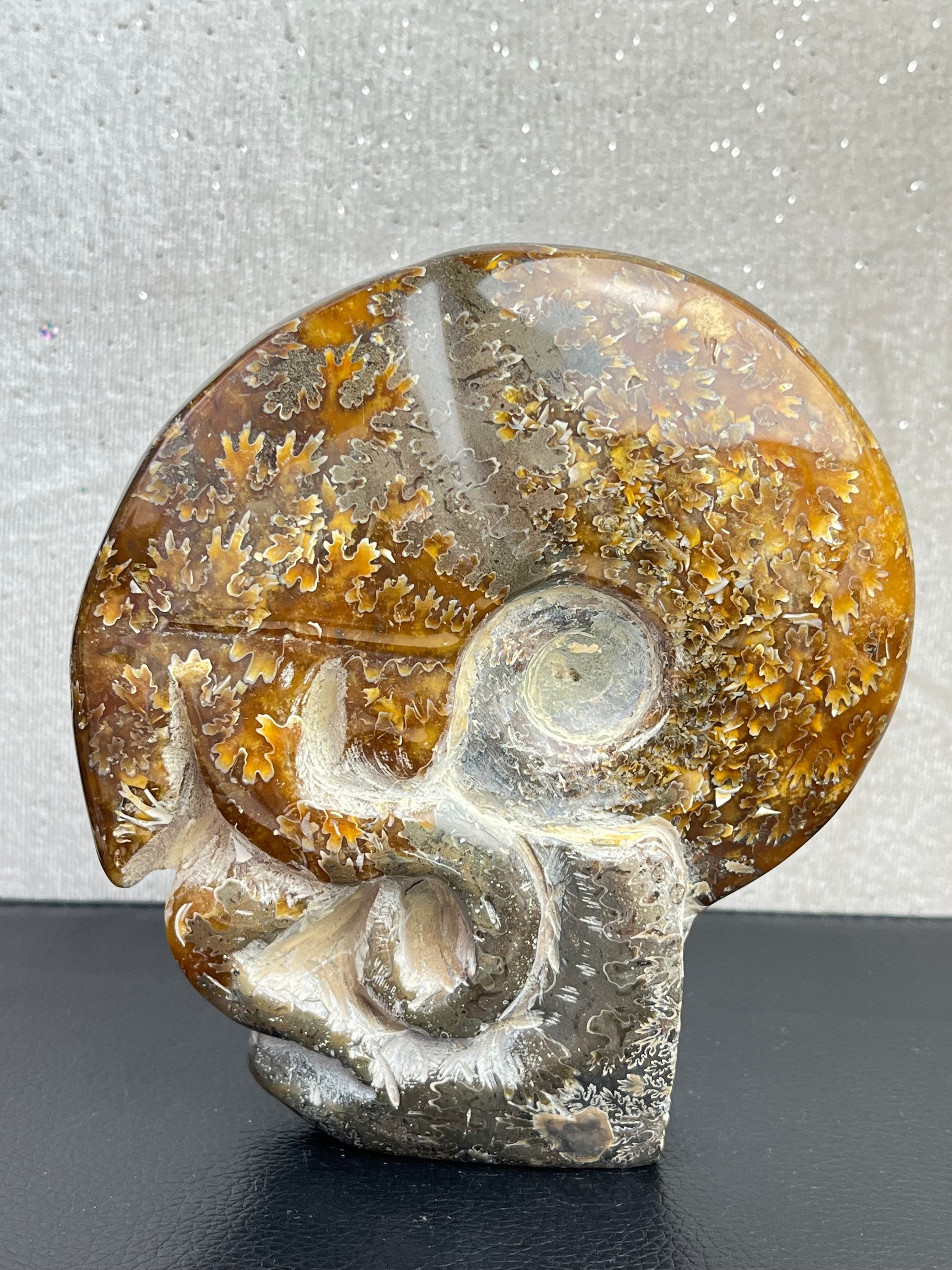 Spiralformen viser vakre mønstre og suturlinjer – en unik kombinasjon av natur og håndverk.