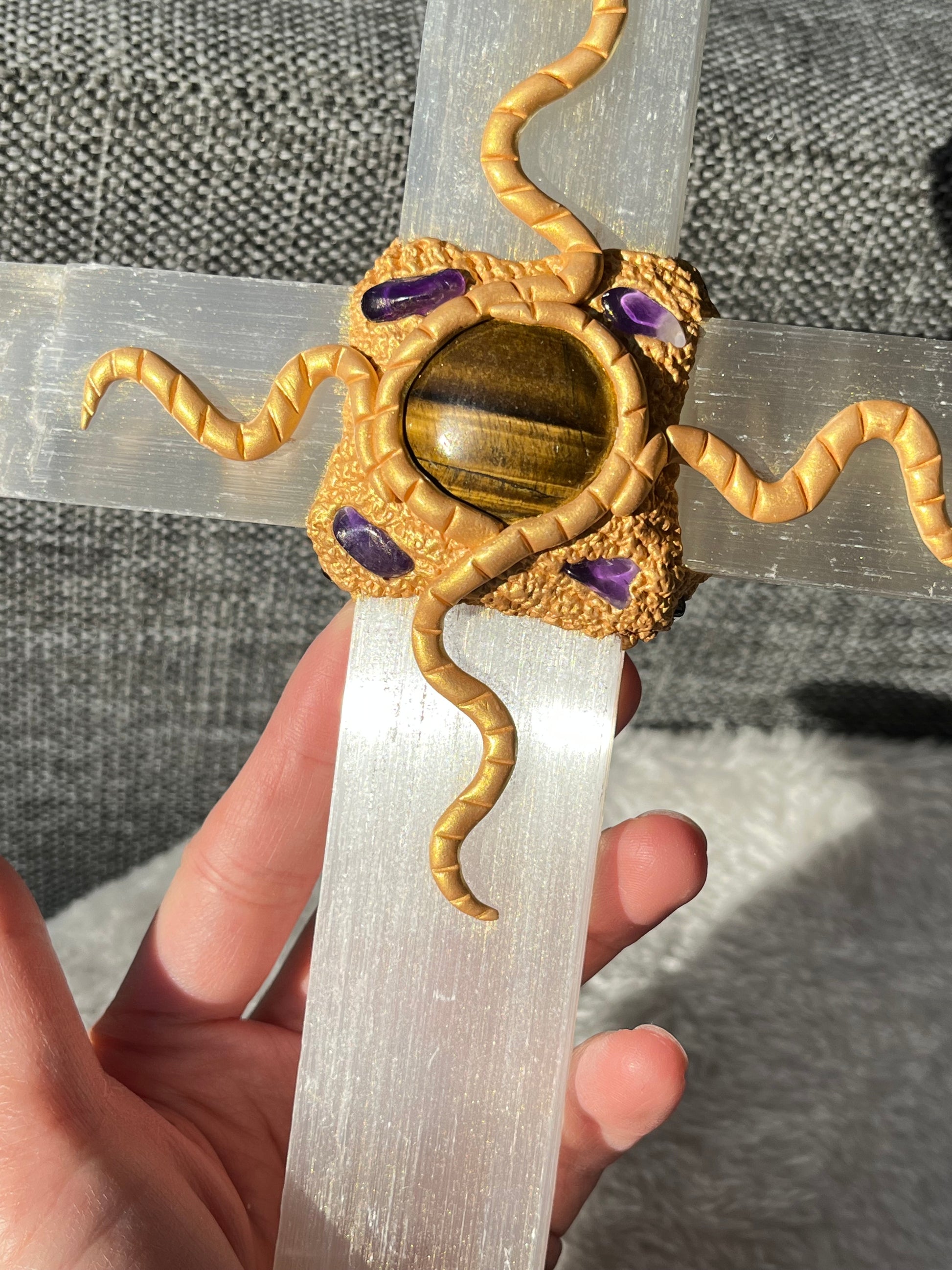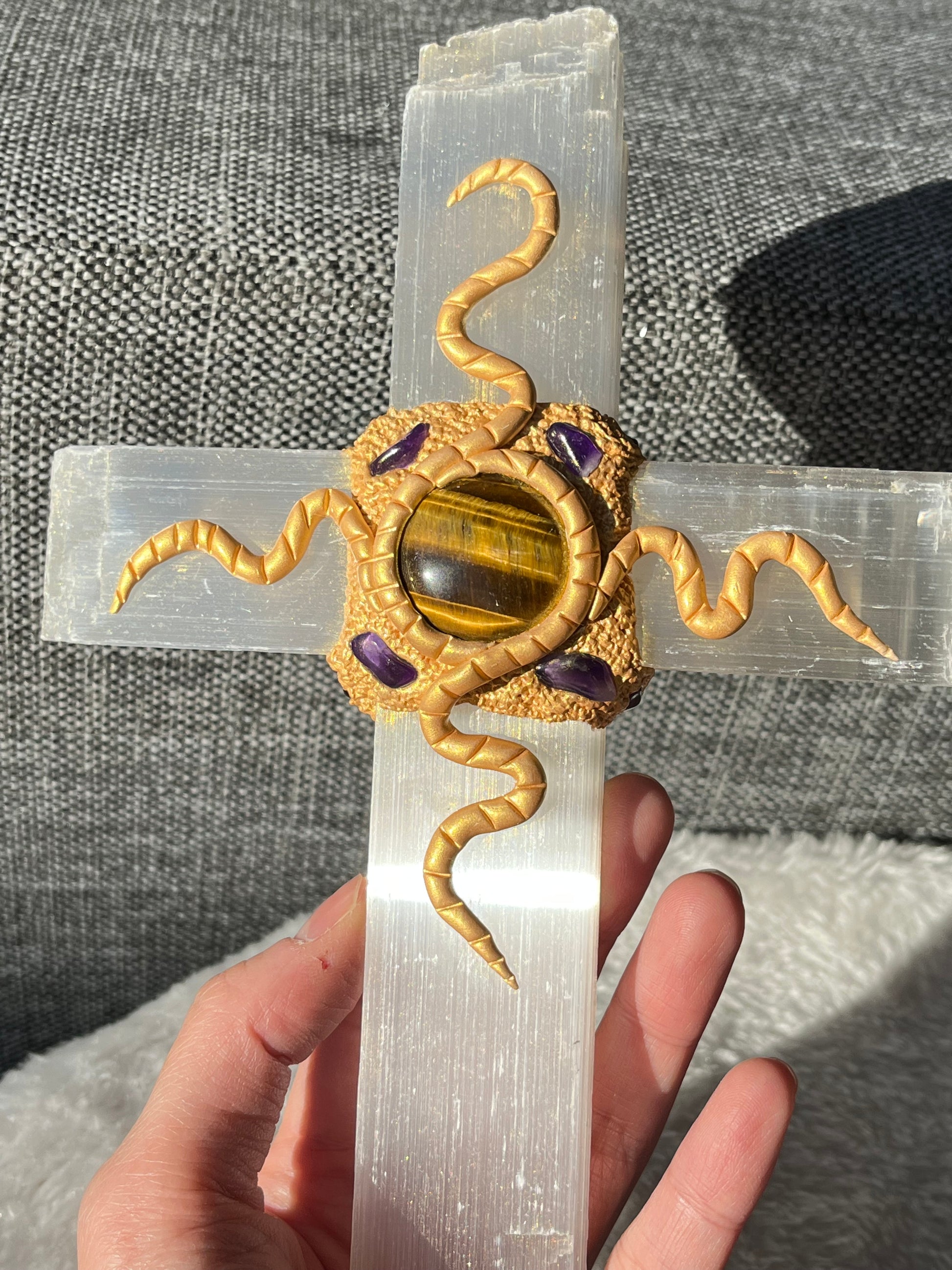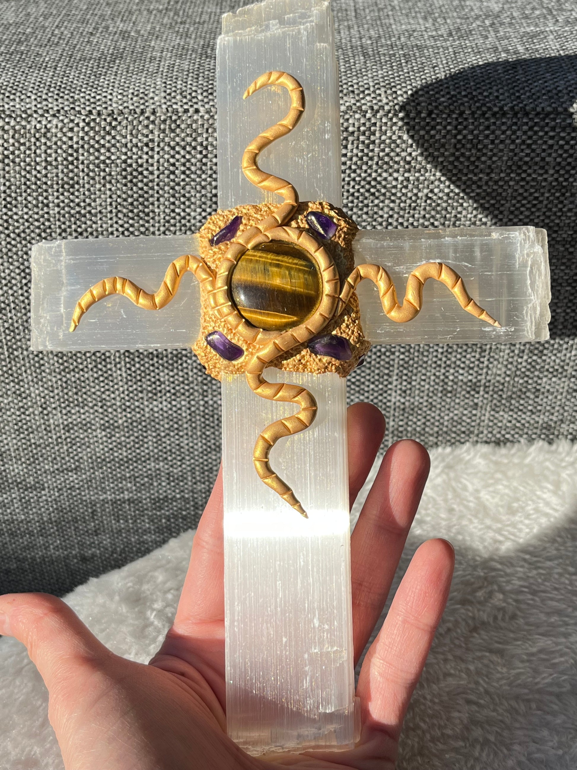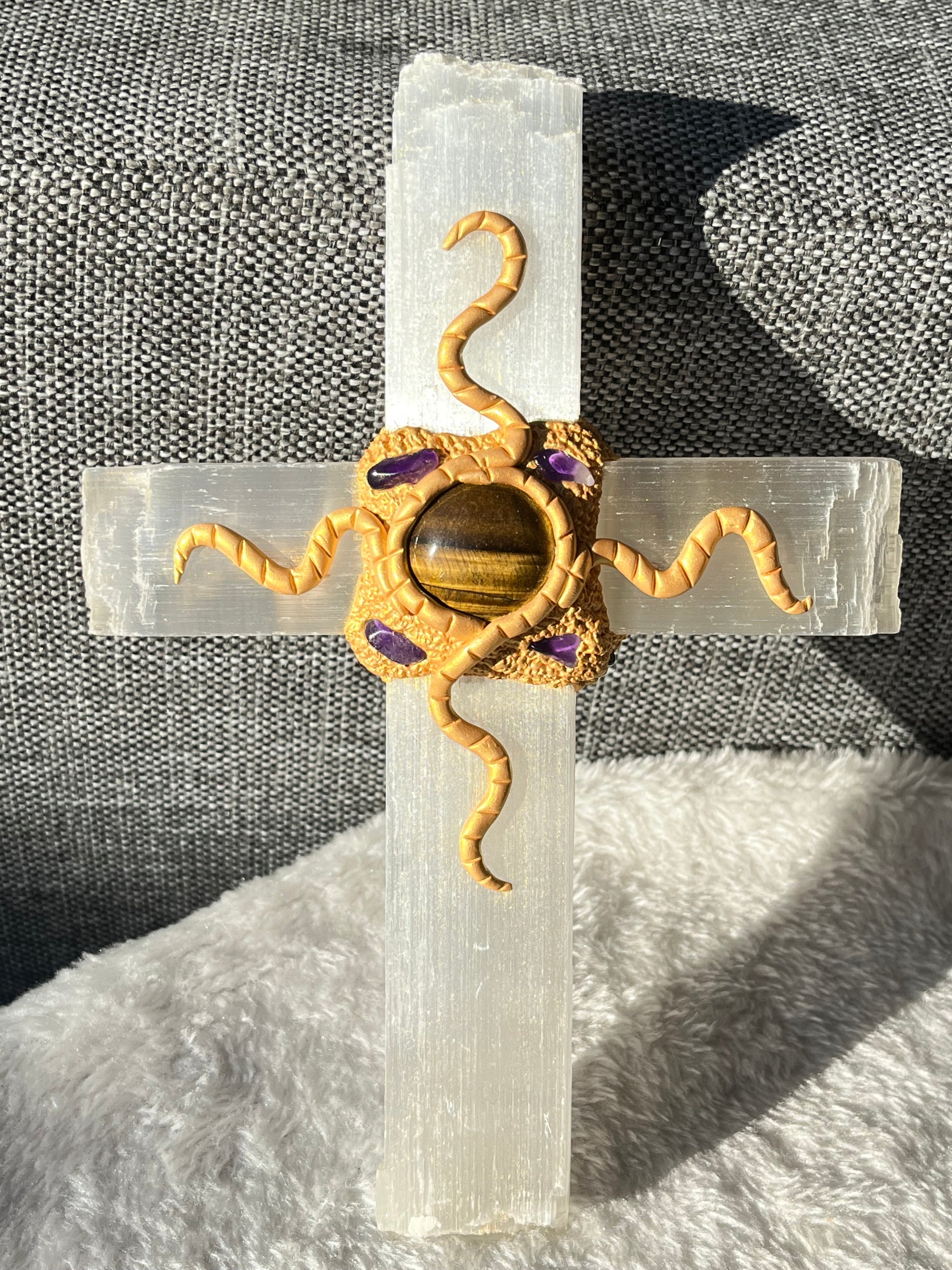 Selenitt Kors (med Tigerøye og Ametyst)